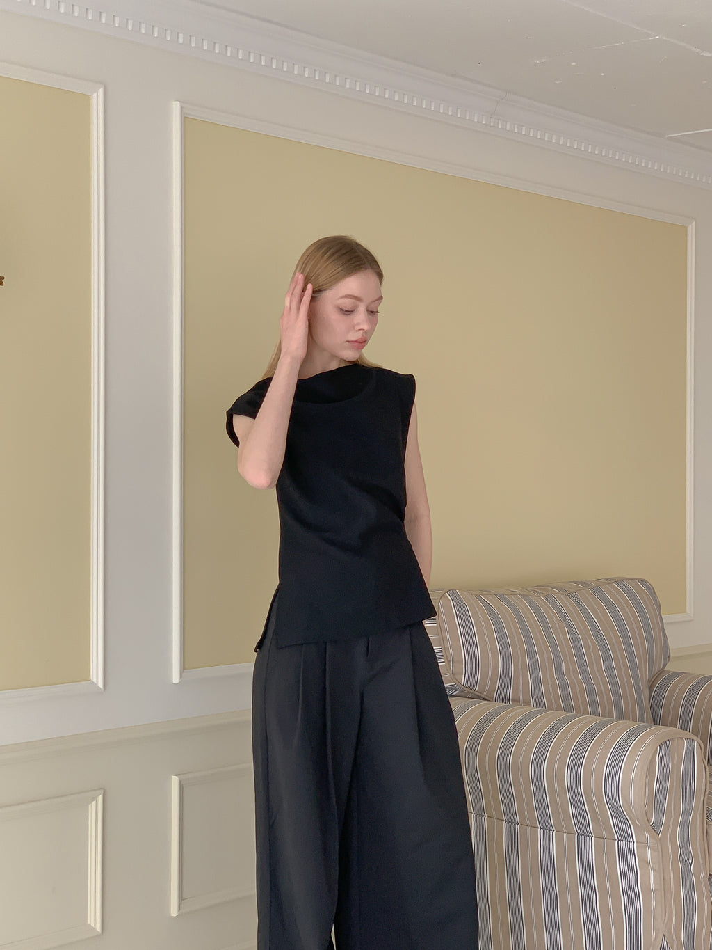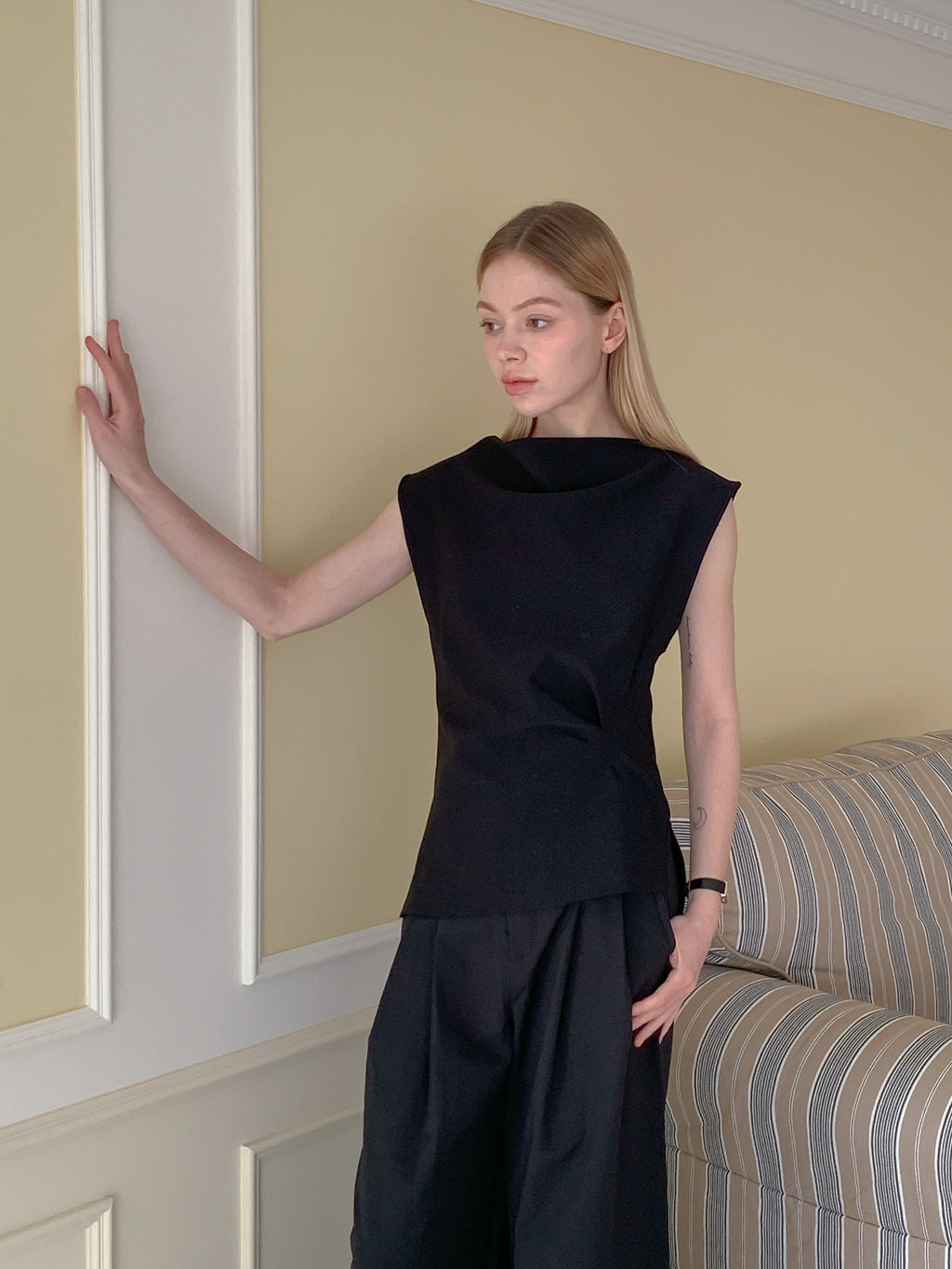 A sleeveless top featuring a softly draped neckline for an elegant, sculptural look. Made from a lightweight, smooth fabric with side slits at the hem to enhance movement. Style it with tailored trousers for a refined touch or pair it with denim for a relaxed elegance.